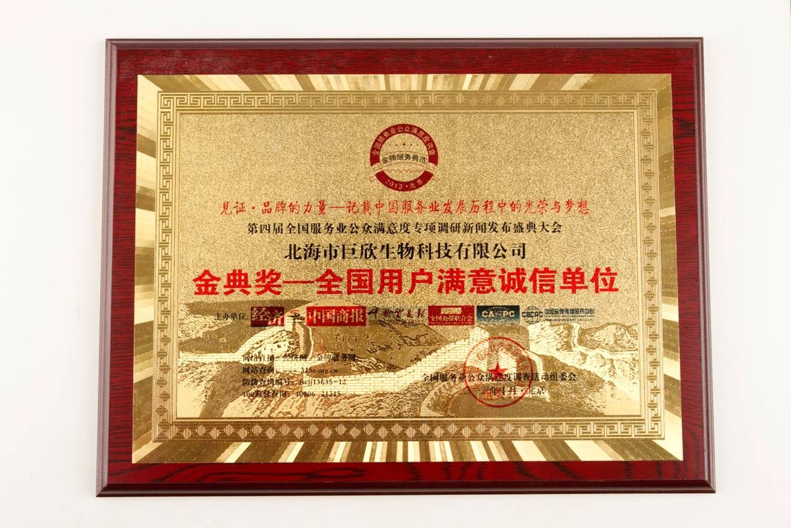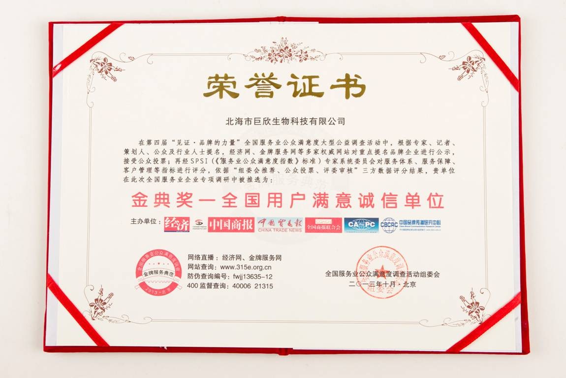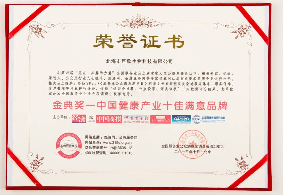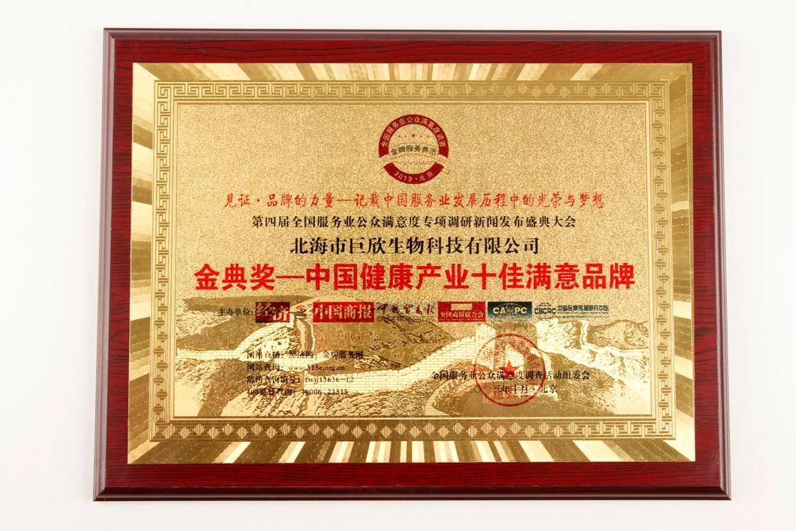 在本次公眾滿意度專項調研活動中,北海市巨欣生物科技有限公司榮獲金典獎“全國用戶滿意誠信單位”和“中國健康產(chǎn)業(yè)十佳滿意品牌”稱號。