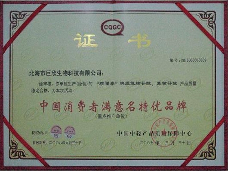 2007年3月28日,“珍福泰”膠囊被中國中輕產(chǎn)品質(zhì)量保障中心批準(zhǔn)為“中國消費(fèi)者滿意名特優(yōu)品牌”。