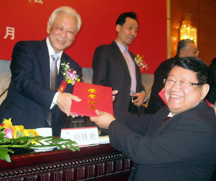 十一屆全國人大常委會副委員長周鐵農(nóng)在人民大會堂為張竟頒發(fā)榮譽證書